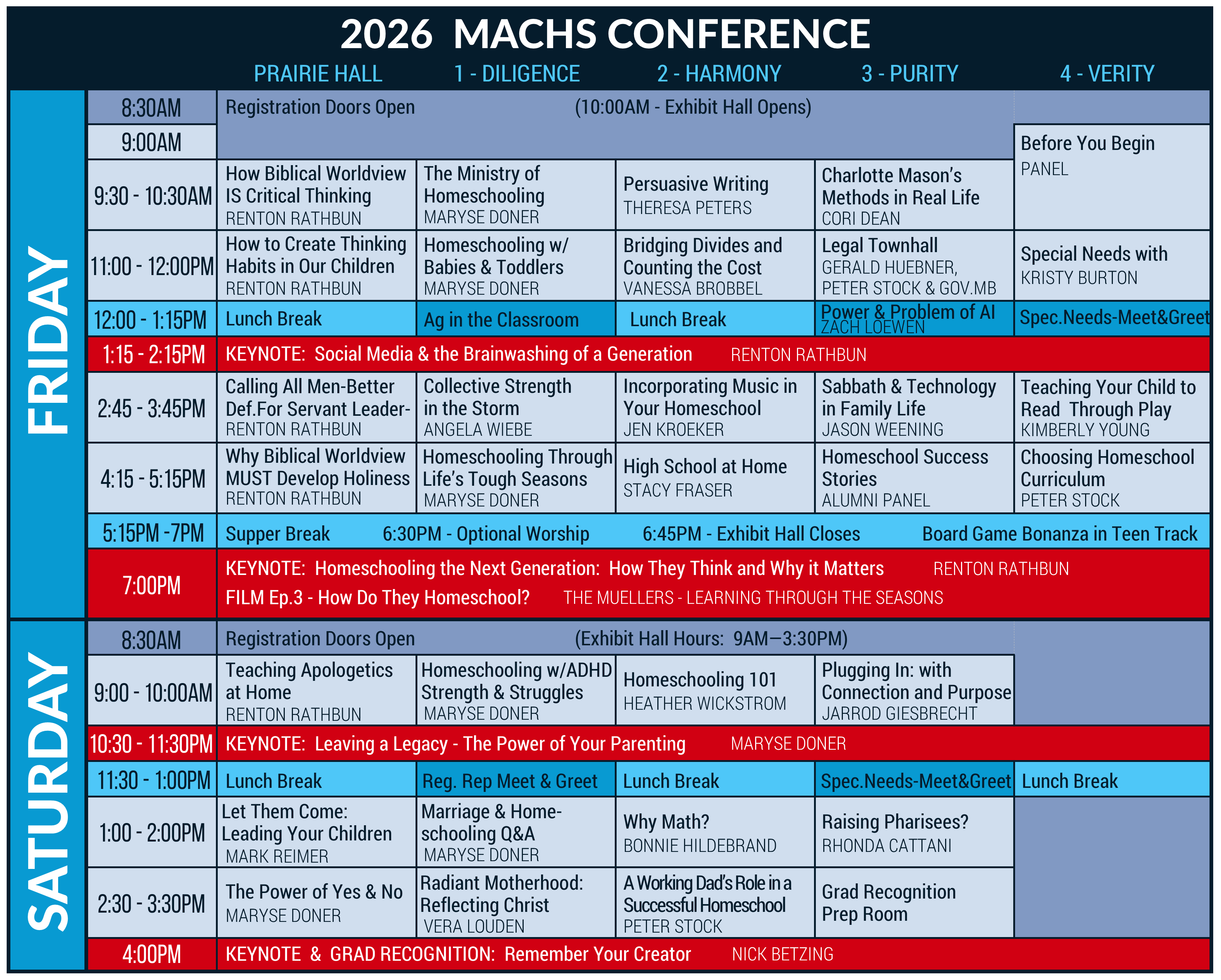 | Friday, March 27 8:30 am – Registration open 9:00 am – FREE Before You Begin Workshop 9:30 am – Workshop 1 and Teen Track 10:00 am – Exhibit Hall open 11:00 am – Workshop 2 12:00 pm – Lunch & Special Needs Meet & Greet 1:15 pm – Keynote – Renton Rathbun 2:45 pm – Workshop 3 4:15 pm – Workshop 4 5:15 pm – Supper Break 6:30 pm – Keynote Prelude and Worship 6:45 pm – Exhibit Hall closes 7:00 pm – Keynote – Renton Rathbun 8:00 pm – Documentary -How Do They Homeschool? -Ep.1 |